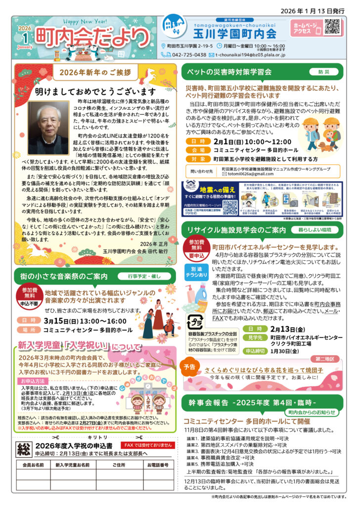玉川学園町内会が考える8つのテーマ「防犯・防災」「行事・催し」「お役立ち」「子育て・シニア」「環境・資源回収」「集会施設」「交通・見守り」「地区」があります。ここでは各テーマの最新記事をお知らせしています。 ※「地区」の情報は「各地区より」をご覧ください。